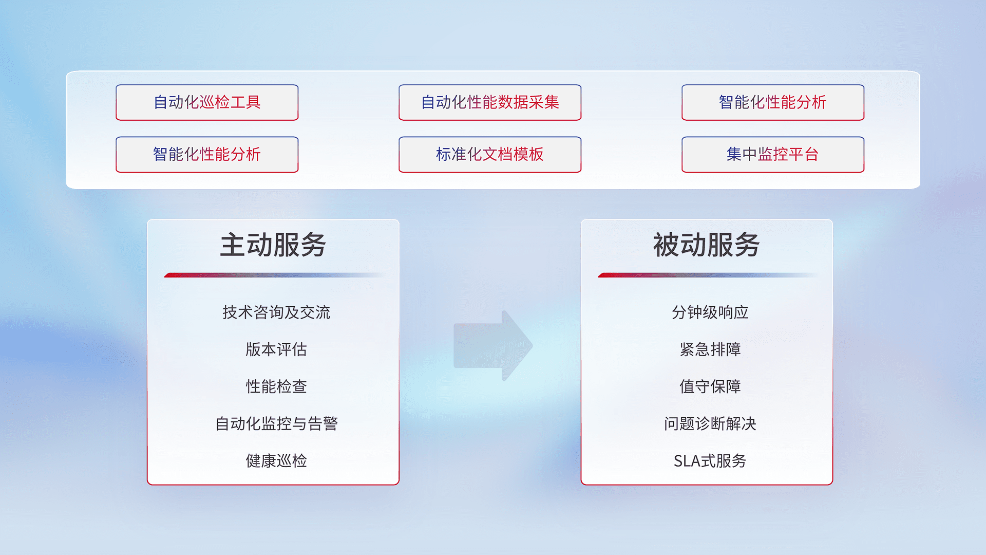 智能化工具和标准化文档,,保障服务质量,,,,提供主动服务(包含技术咨询、、、版本评估、、、性能检查、、、、自动化监控与告警、、、、健康巡检)和被动服务包含(分钟级响应、、紧急排障、、、、值守保障、、、、问题诊断解决、、、、SLA服务)。。。。