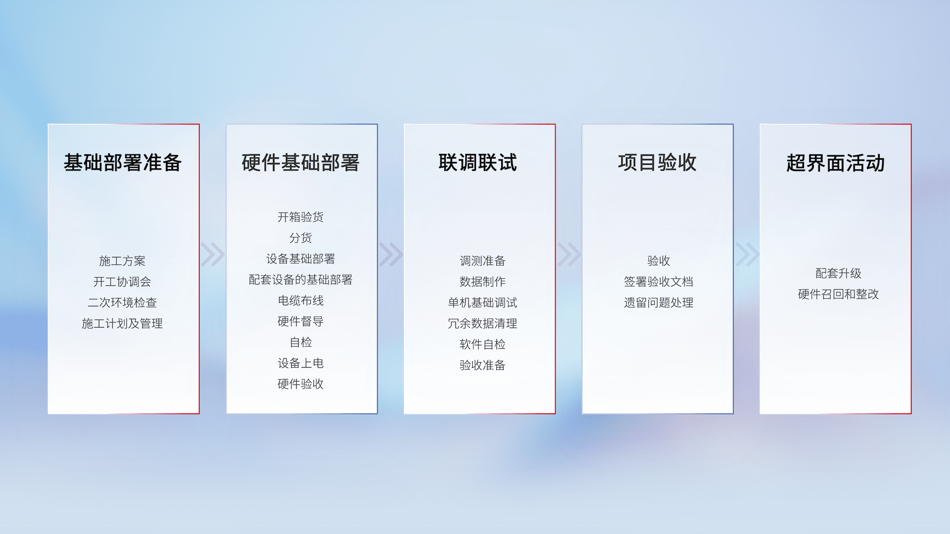 从基础部署准备、、硬件基础部署、、联调联试、、项目验收、、、、越界面活动的全过程可追溯,,,保证施工质量和进度。。。